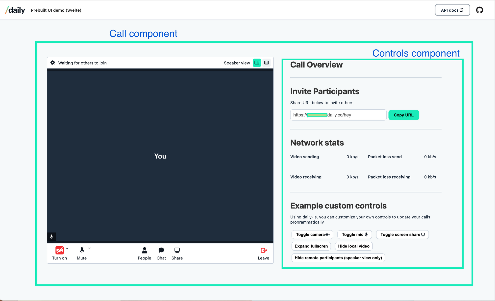 - The call UI, which includes the Daily Prebuilt embed and our custom call controls