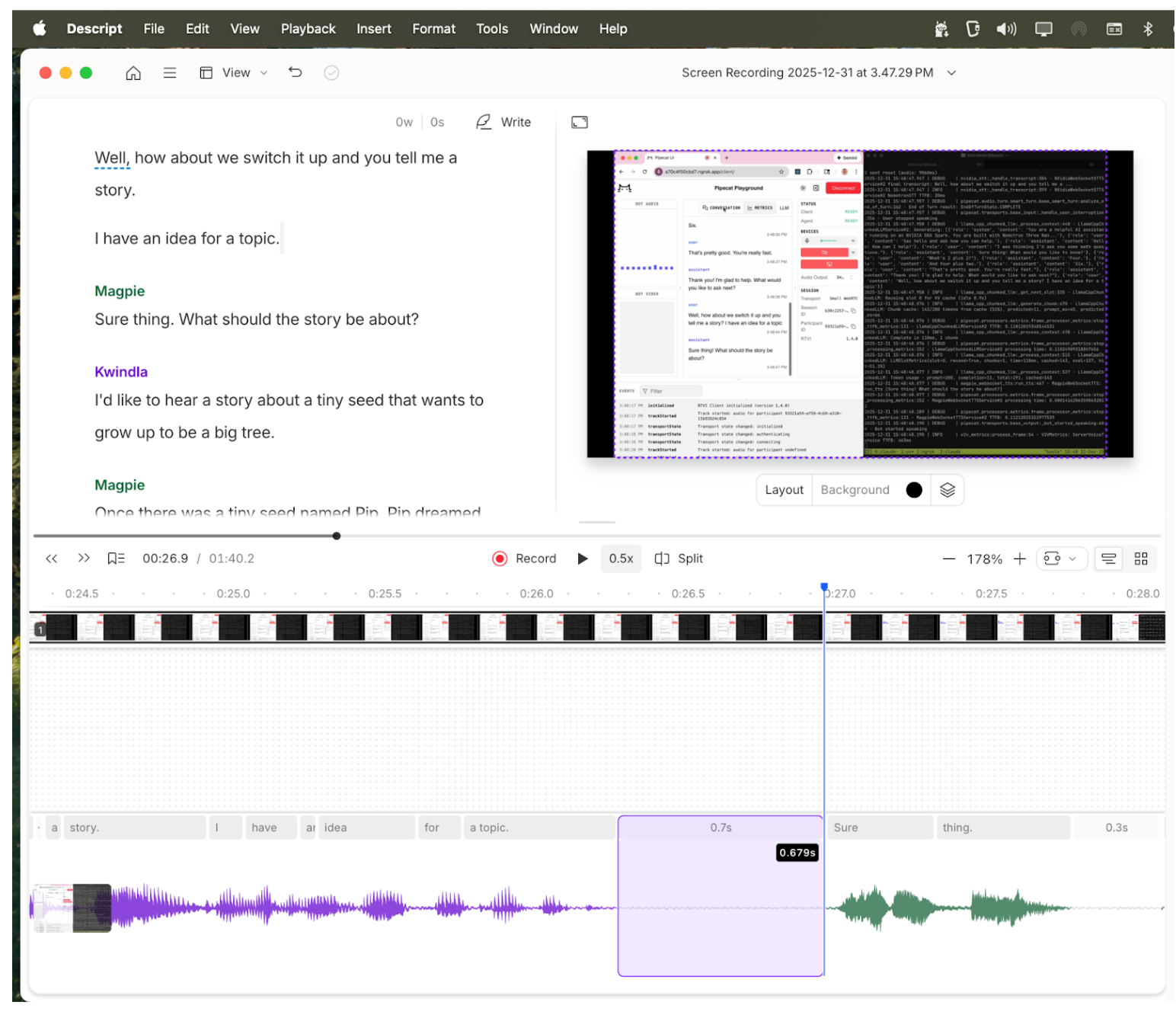It’s also critical to measure the voice-to-voice latency as actually perceived by the user. This is harder to do automatically, especially for telephone call voice agents. The best approach to measuring client-side voice-to-voice latency is to record a call, load the audio file into an audio editor, and measure the gap between the end of the user’s speech waveform and the start of the bot speech waveform. You can’t cheat this measurement, or forget to include an important processing component! We do this periodically in both development and testing, as a sanity check. Here I’m measuring latency in the Descript editor of one turn in the conversation we recorded for the video at the top of this post.