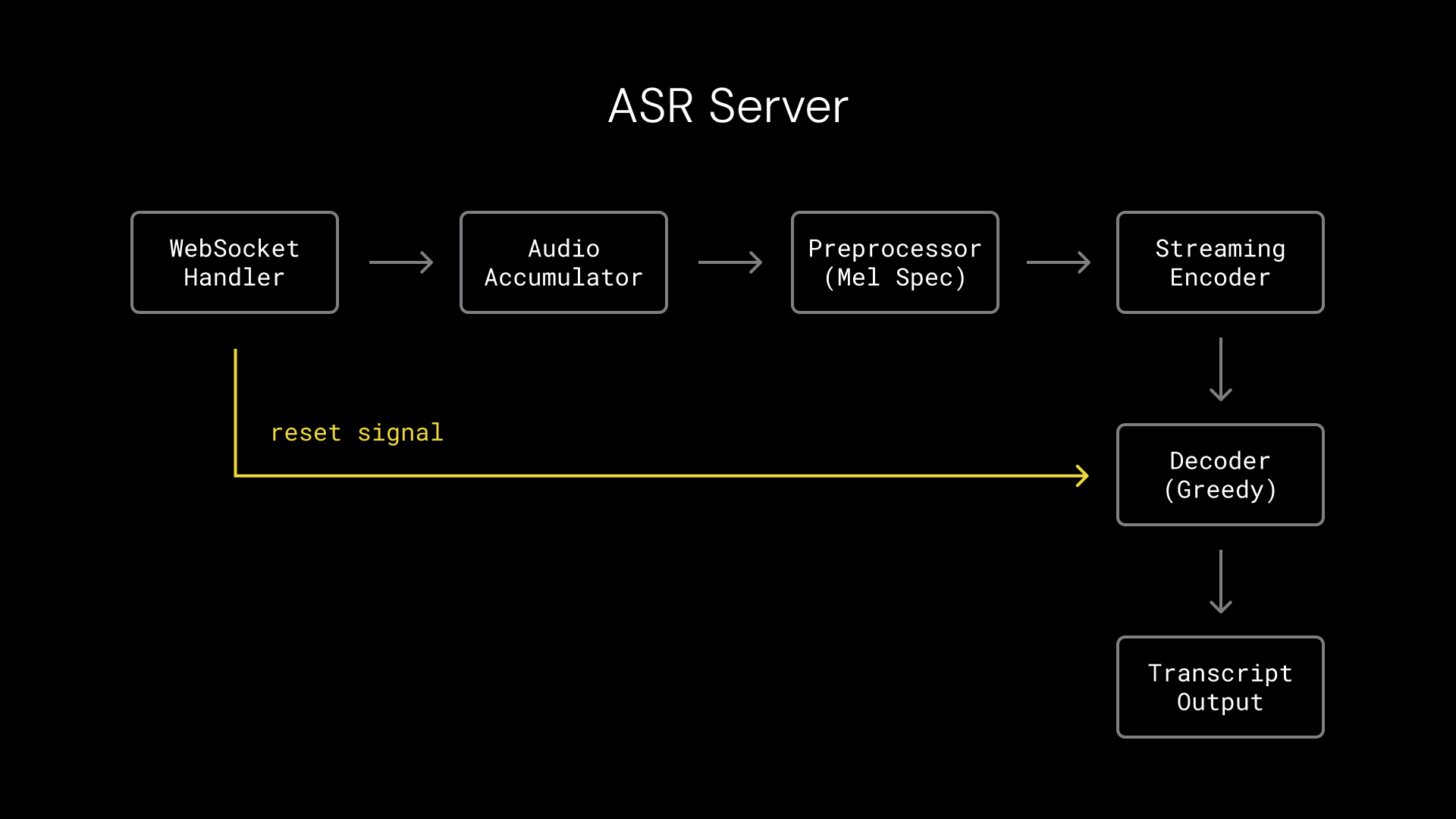 To integrate Nemotron Speech ASR into Pipecat, we created a WebSocket server that performs the transcription inference and a client-side Pipecat service that can be used in any Pipecat agent.