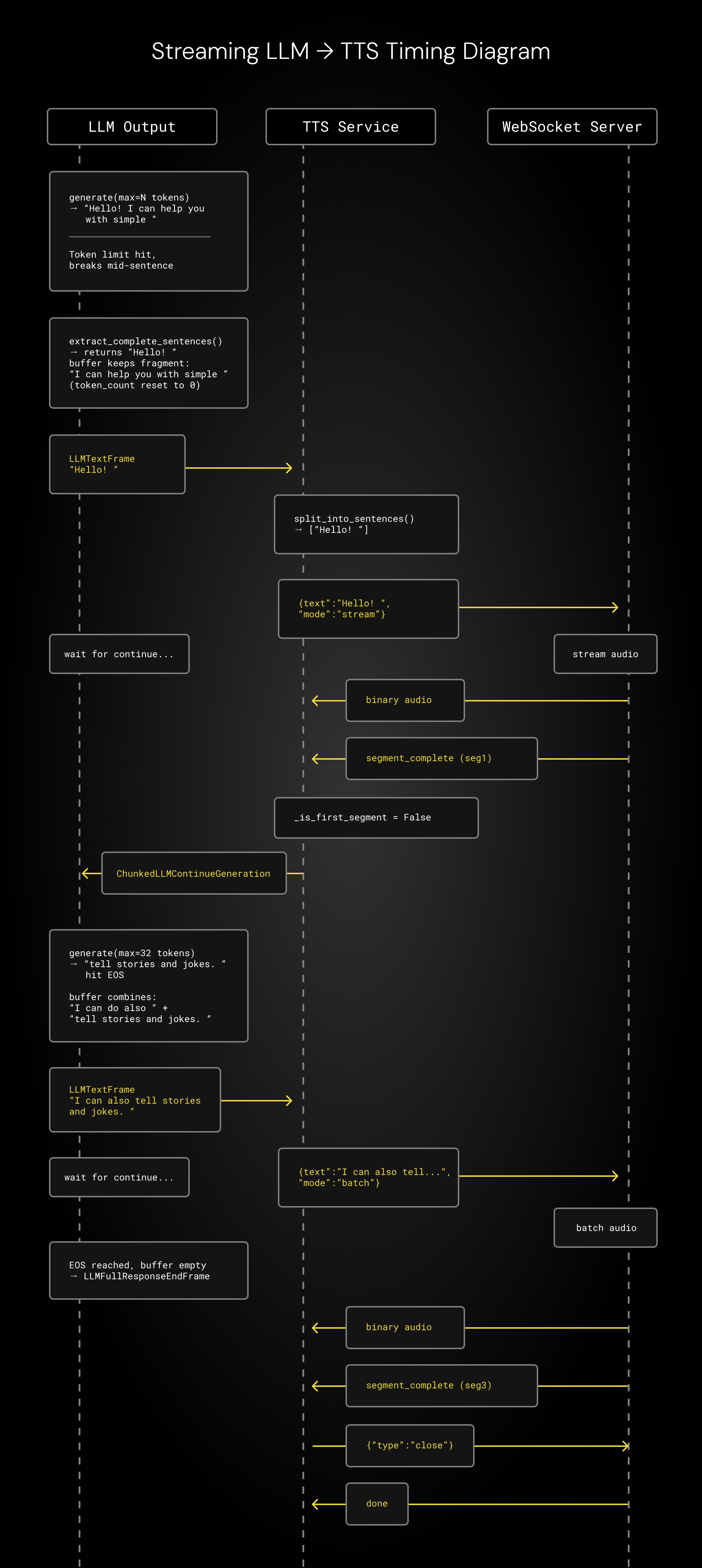 Here’s a sequence diagram showing the interleaved LLM and TTS inference. The three vertical lines in the diagram represent, from left to right: