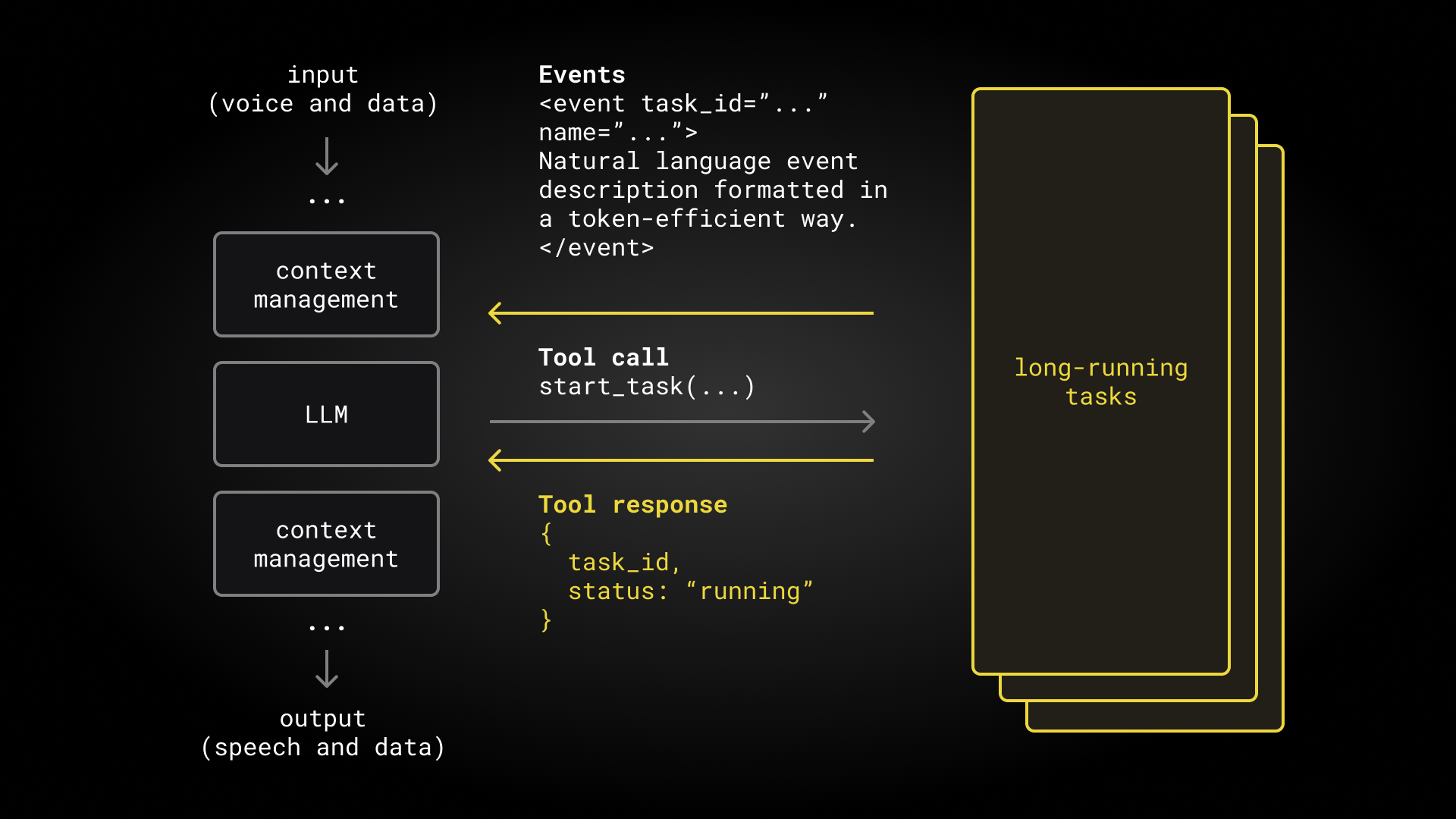 Whether we use a pipeline or a unified speech-to-speech model, voice agents are doing more and more sophisticated tasks. This means that, increasingly, production voice agents are actually multi-agent systems. Inside an agent, sub-agents handle asynchronous tasks, manage the conversation context, and allow code re-use between text and voice agents.