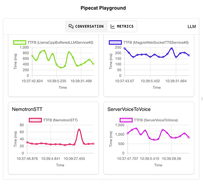We also output log lines with time-to-first-byte for each of our models, and several other log lines that are useful for understanding exactly where we’re “spending our latency budget.” The Pipecat Playground shows graphs of these metrics, which is useful during development and testing. Here’s a test session with our bot running on an RTX 5090.