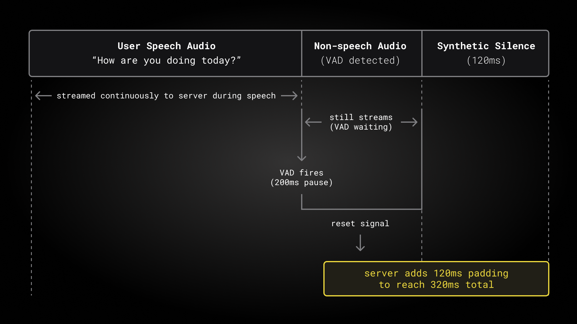 We trigger both turn detection and transcript finalization any time we see a 200ms pause in the user’s speech. This gives us 200ms of “non-speech” trailing context after the user’s speech has finished. The Nemotron Speech ASR model actually needs a bit more trailing silence than this, to properly finalize the last words in the user speech. The padding calculation is: