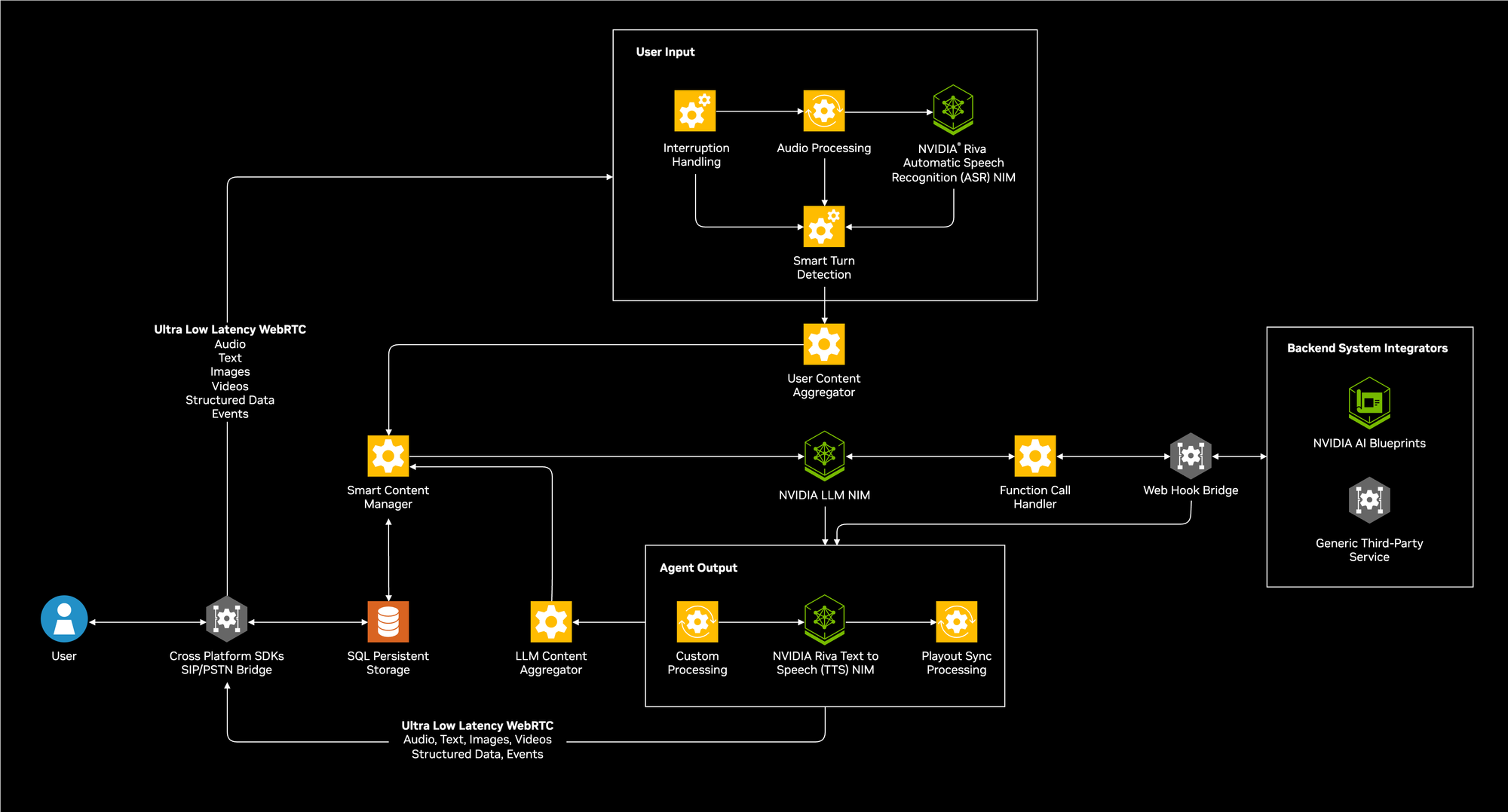 Today we’re sharing the new NVIDIA AI Blueprint, Voice Agents for Conversational AI, powered by Pipecat and NVIDIA NIM. Developed in collaboration with NVIDIA, this blueprint shows how companies can build state-of-the-art agentic experiences with Pipecat and NVIDIA AI.