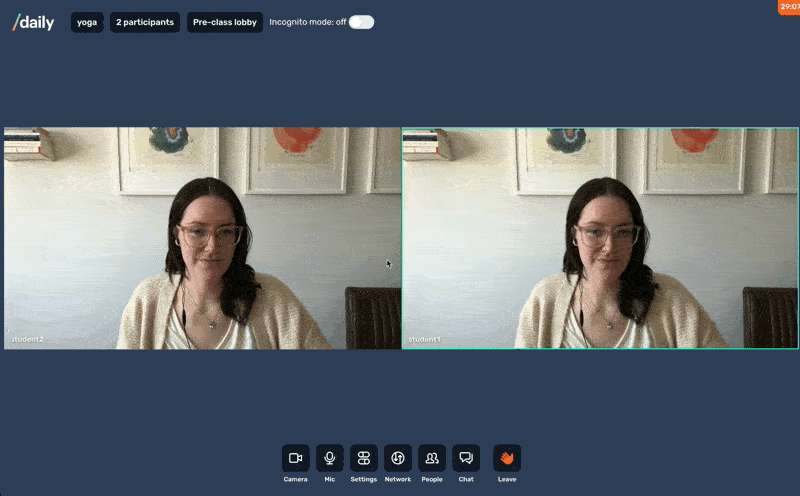 In today’s post, we’ll look at how to add this sense of privacy to your participants’ in-class experience, too. We’ll add a toggle input in the fitness demo app UI for students to turn on “incognito mode”, which means only the instructor will be able to see their video. You could change this so that no one can see their video, but we find instructors usually need to be able to see what class participants are doing.