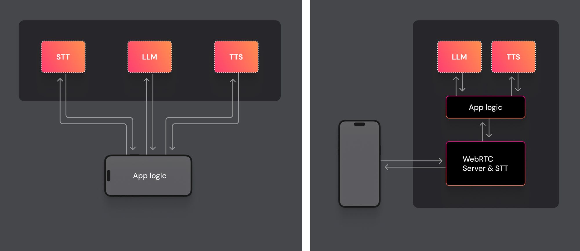 Moving some of your application logic into the cloud has other benefits in addition to reducing total latency. You control the compute and network available to your app in the cloud. So you can do things in the cloud that you simple can’t do locally. For example, you can run your own private LLM – say, the very capable Llama2 70B – inside the app logic box in the right diagram!