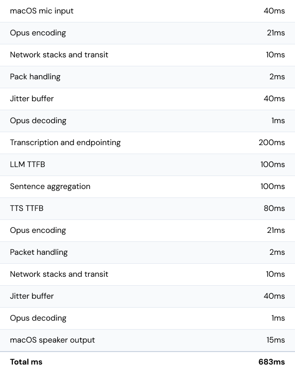 We are targeting an 800ms median voice-to-voice response time. This architecture hits that target and in fact can achieve voice-to-voice response times as low as 500ms.